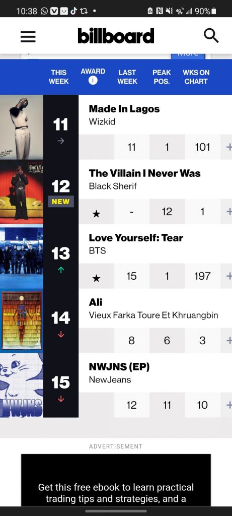 The 20 year old Ghanaian artist released his debut album titled ”the villian i never was” on 5th October this year has made broke into the Top BillBoard Chart.