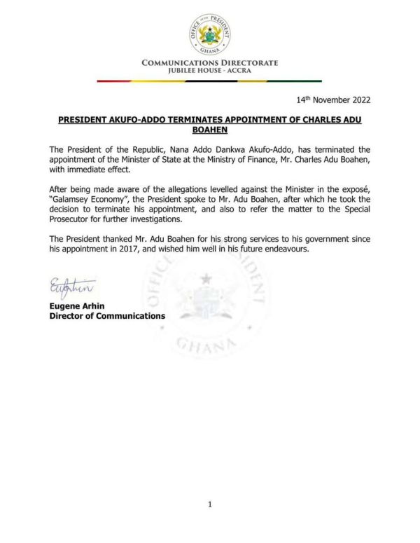 According to a statement signed by Eugene Arhin, “after being made aware of the allegations leveled against the Minister in the exposé, ‘Galamsey Economy,’ the President spoke to Mr Adu Boahen, after which he took the decision to terminate his appointment, and also to refer the matter to the Special Prosecutor for further investigations.”