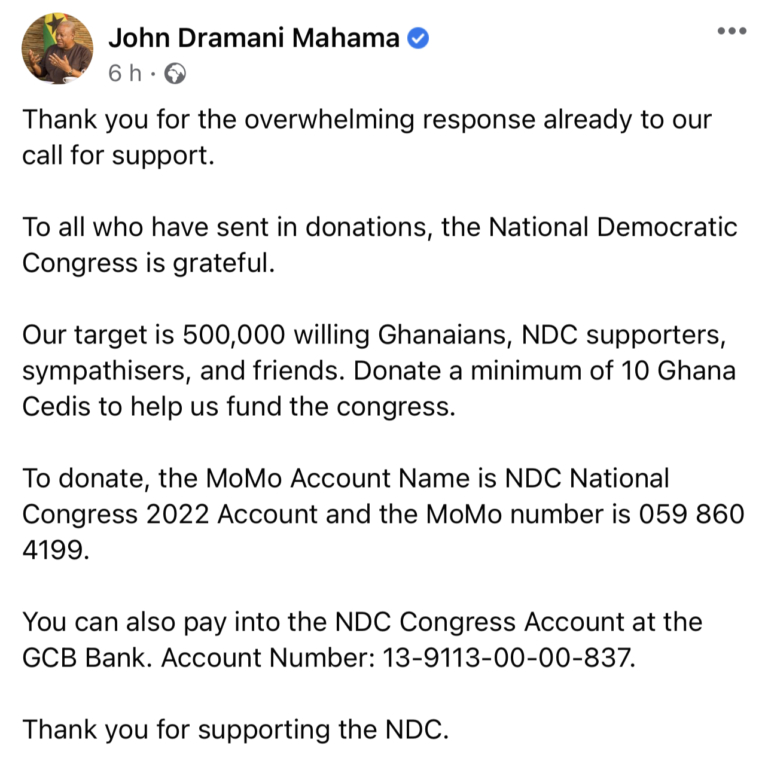 “I am inviting 500,000 willing Ghanaians, NDC supporters, sympathisers, and friends to donate a minimum of 10 Ghana Cedis each to help us fund the congress. You dont have to be a member of the NDC to donate.