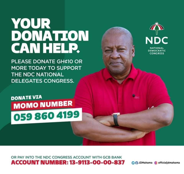 “Please donate via MoMo number 059 860 4199. Or pay into the NDC Congress Account at the GCB Bank. Account Number: 13-9113-00-00-837. If you want to arrange other forms of support, please send me an email- [email protected],” he appealed.