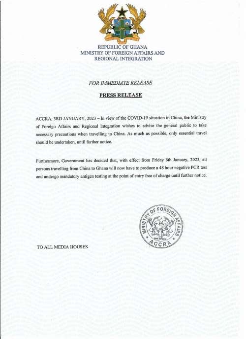The Foreign Affairs Ministry also stated that effective Friday, January 6, all persons traveling from China to Ghana will be required to produce a 48-hour negative PCR test and will be subjected to mandatory antigen testing at a point of entry at no cost until further notice.