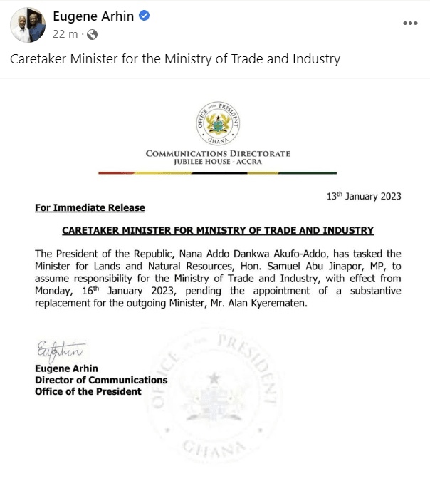 Nana Addo Dankwa Akufo-Addo has asked Samuel Abu Jinapor, the Minister for Lands and Natural Resources to start his responsibility as Minister of Trade and Industry with effect from Monday, January 16, 2023, as he replaces outgoing Minister Alan Kyerematen.